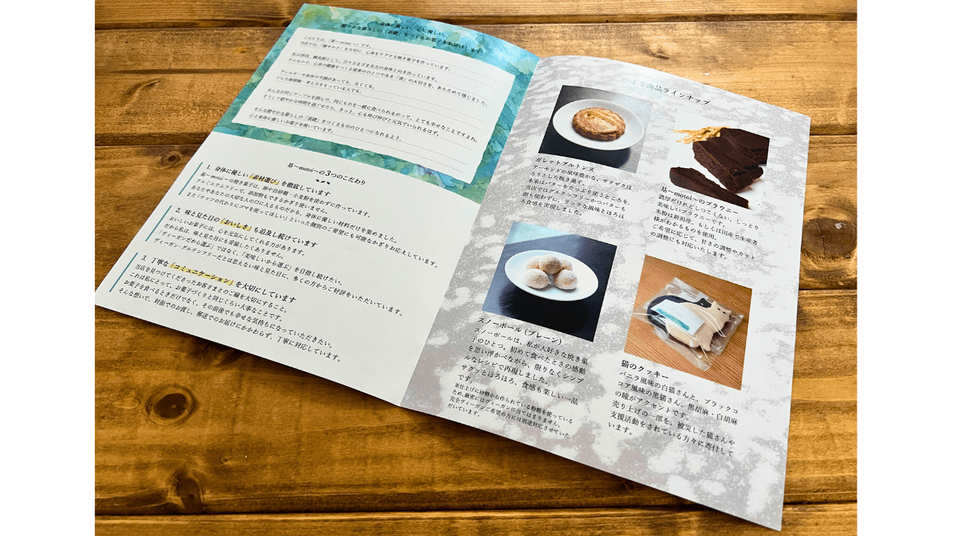 京都府でグルテンフリー・ヴィーガンのお菓子を製造・販売されている、「基~motoi~」さまのパンフレット制作を担当。